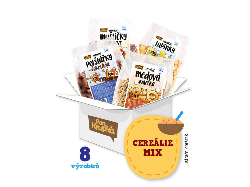 Křupavé cereálie jsou oblíbenou snídaní nejen dětí. V kombinaci s mléčným výrobkem a kouskem čerstvého ovoce odstartujete den v pohodě bez náročných příprav. Náš TIP - smíchejte dětem všechny druhy dohromady, ať je snídaně i zábavou. Objednávejte náš mix 8x 500g balení za výhodnou cenu!